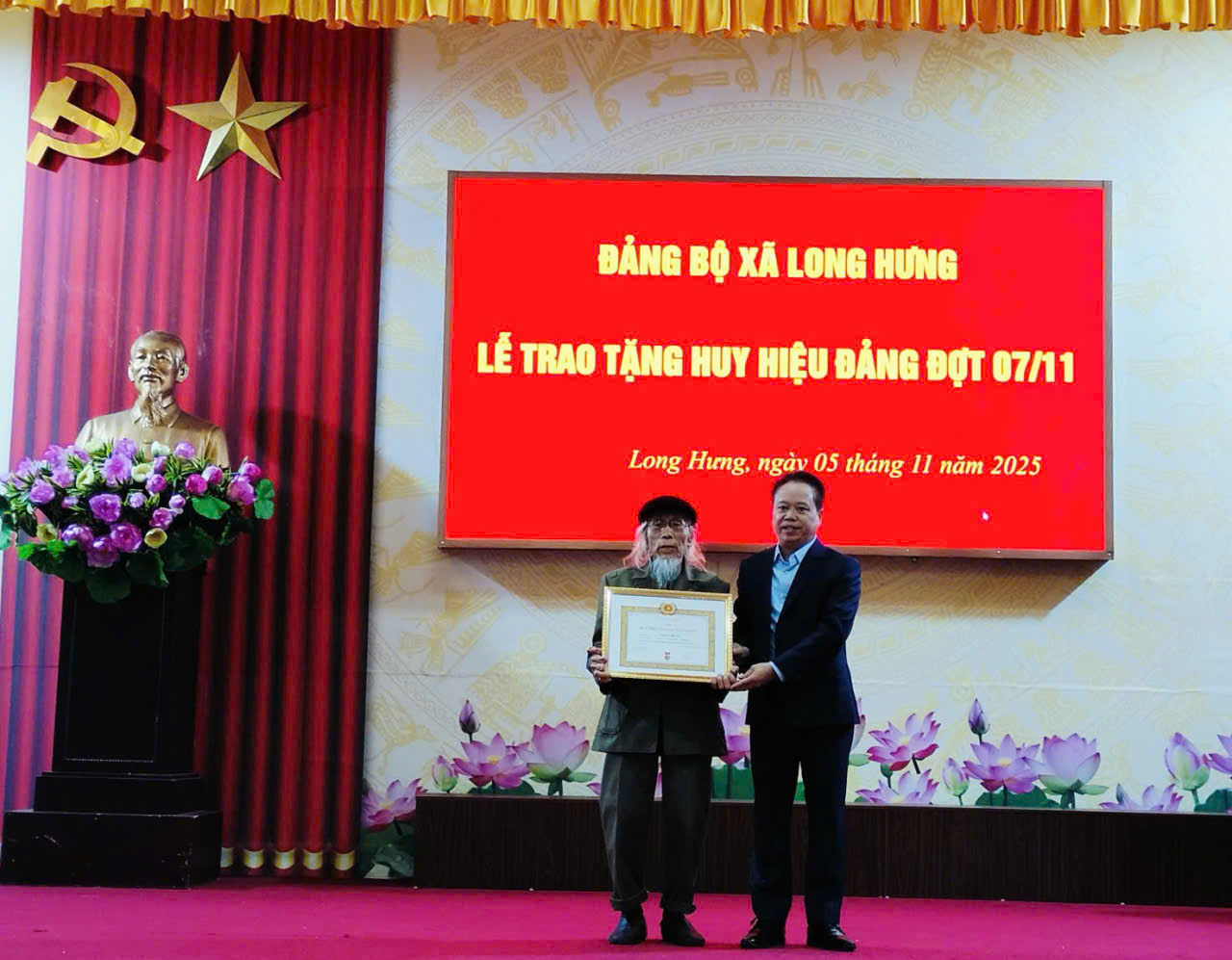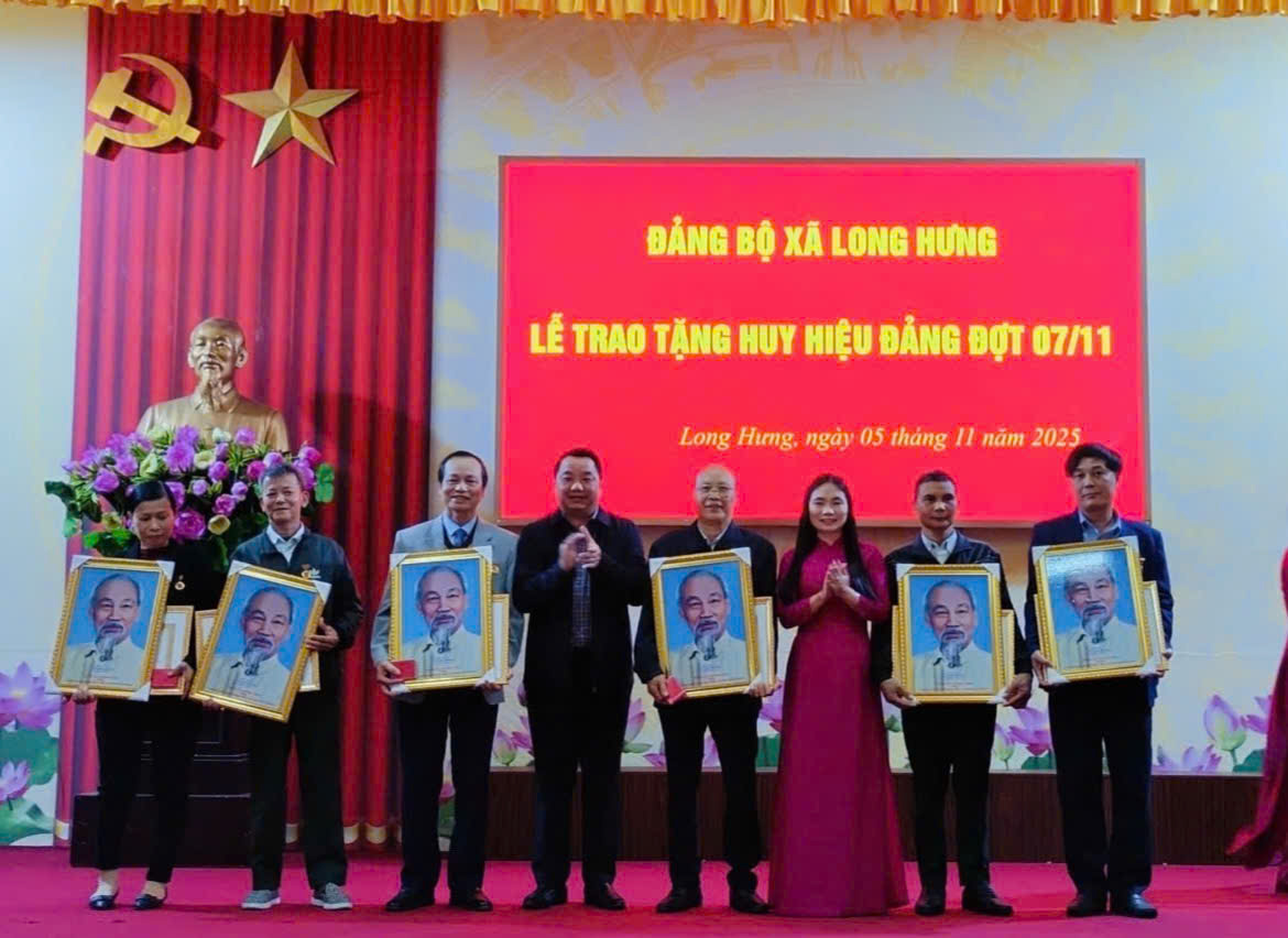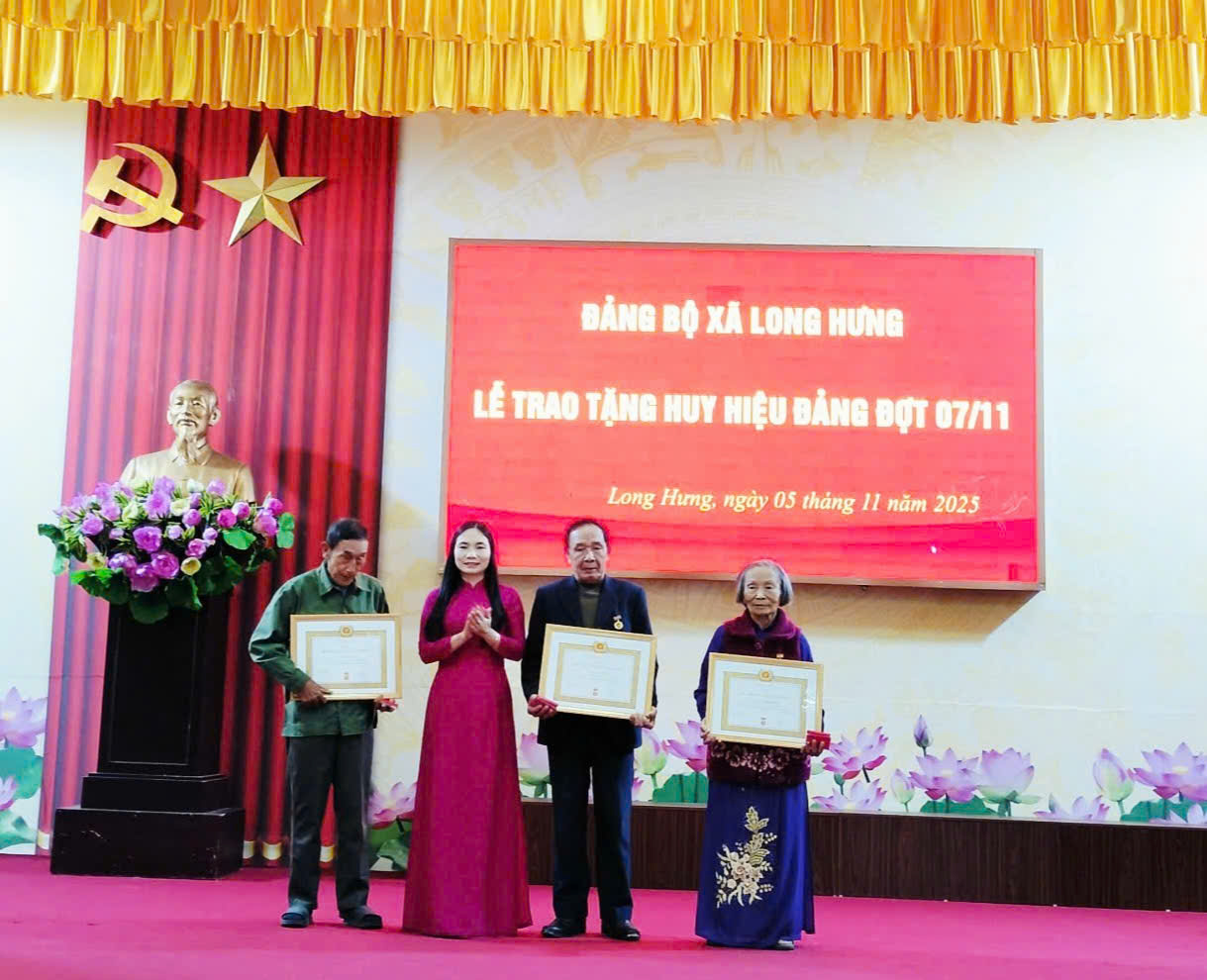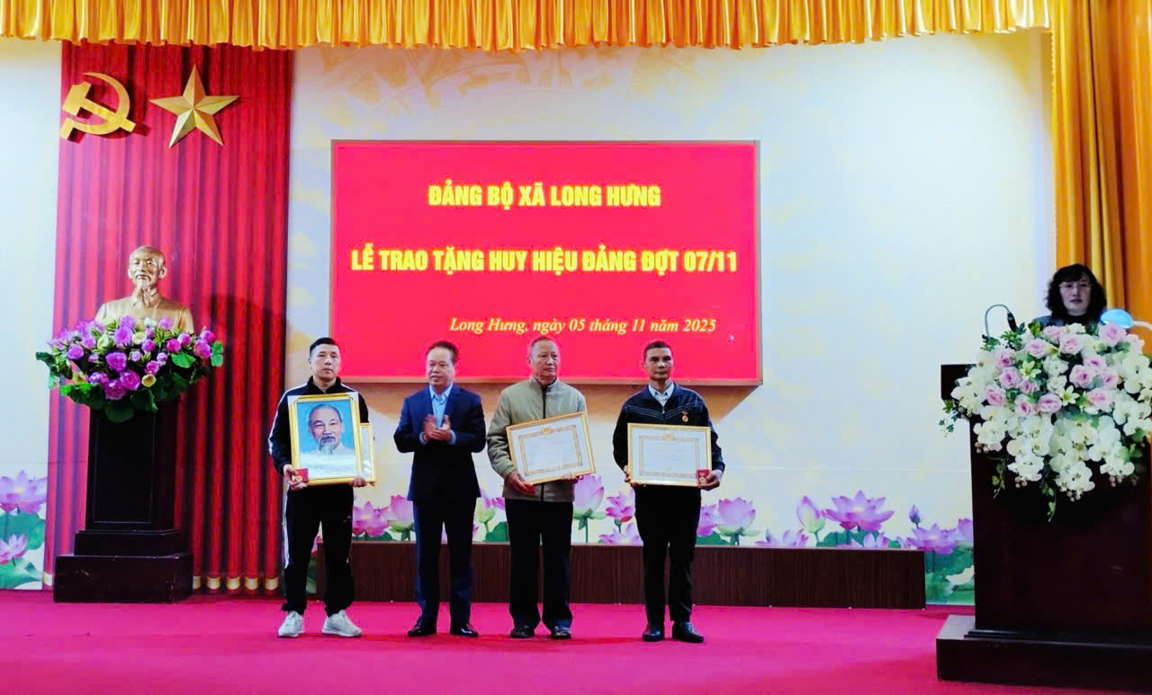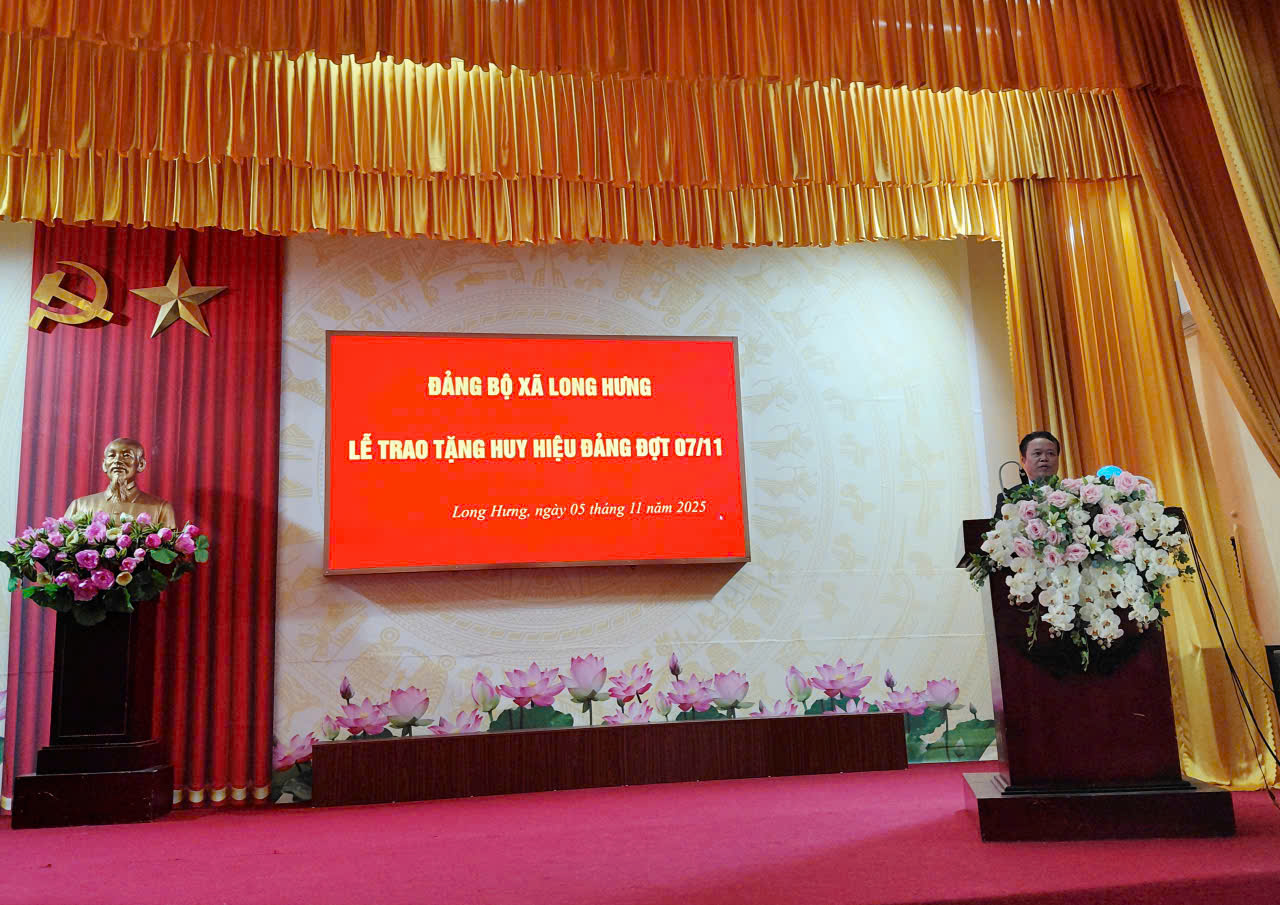 Chiều ngày 05/11/2025 tại Hội trường Nhà Văn hoá xã Long Hưng, Đảng ủy tổ chức Lễ trao huy hiệu Đảng đợt 07/11. Về dự hội nghị có đồng chí Phạm Văn Bình – Bí thư Đảng ủy, Chủ tịch Hội đồng nhân dân xã; đồng chí Vũ Thị Hương – Phó Bí thư Thường trực Đảng ủy; đồng chí Phạm Thành Tâm – Phó Bí thư Đảng uỷ, Chủ tịch Ủy ban nhân dân xã; các đồng chí trong Ban Thường vụ Đảng uỷ, Ban Chấp hành Đảng bộ xã; Các đồng chí Bí thư Đảng bộ, Bí thư chi bộ trực thuộc Đảng uỷ xã; Hiệu trưởng nhà trường; Các đồng chí Trưởng thôn, tổ trưởng tổ dân phố; đảng viên được tặng huy hiệu Đảng đợt 07/11/2025.