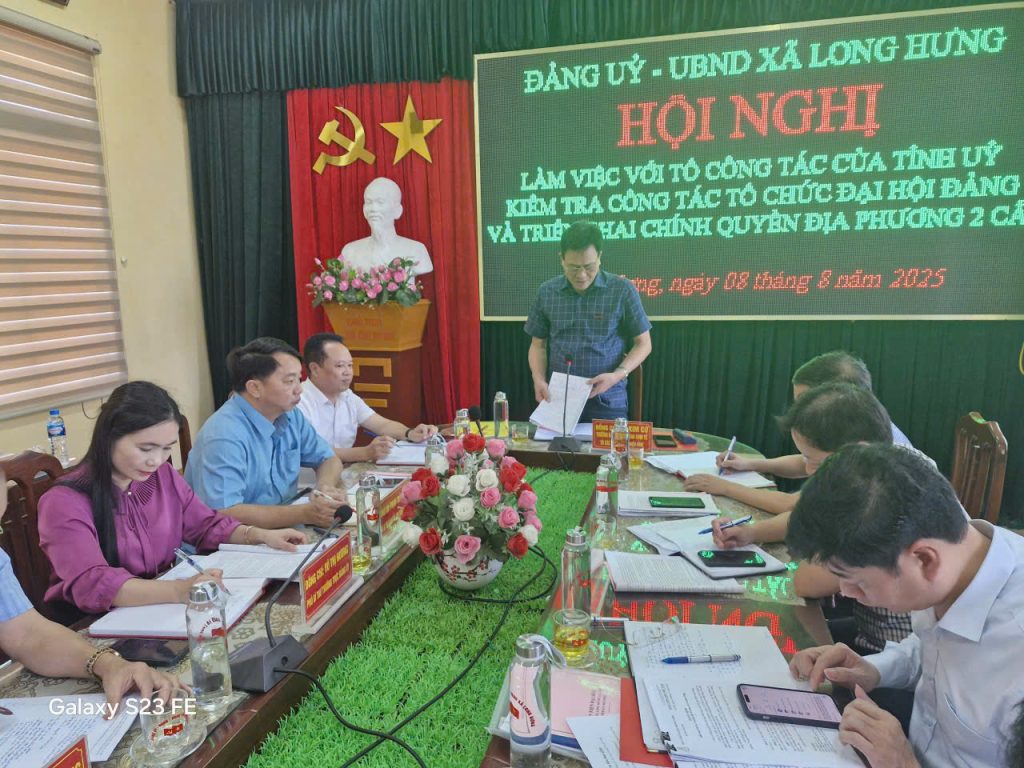 Sáng ngày 08/8/2025 tổ công tác số 15- Đoàn kiểm tra của Tỉnh uỷ đã về làm việc tại xã Long Hưng: Kiểm tra công tác tổ chức Đại hội và triển khai bộ máy chính quyền 2 cấp. Dự buổi kiểm tra có đồng chí Vũ Kim Cứ, Ủy viên Ban Thường vụ Tỉnh ủy, Trưởng ban quản lý Khu kinh tế và công nghiệp tỉnh, Tổ trưởng Tổ công tác cùng các đồng chí lãnh đạo Văn phòng Tỉnh uỷ, các sở, ngành của tỉnh.