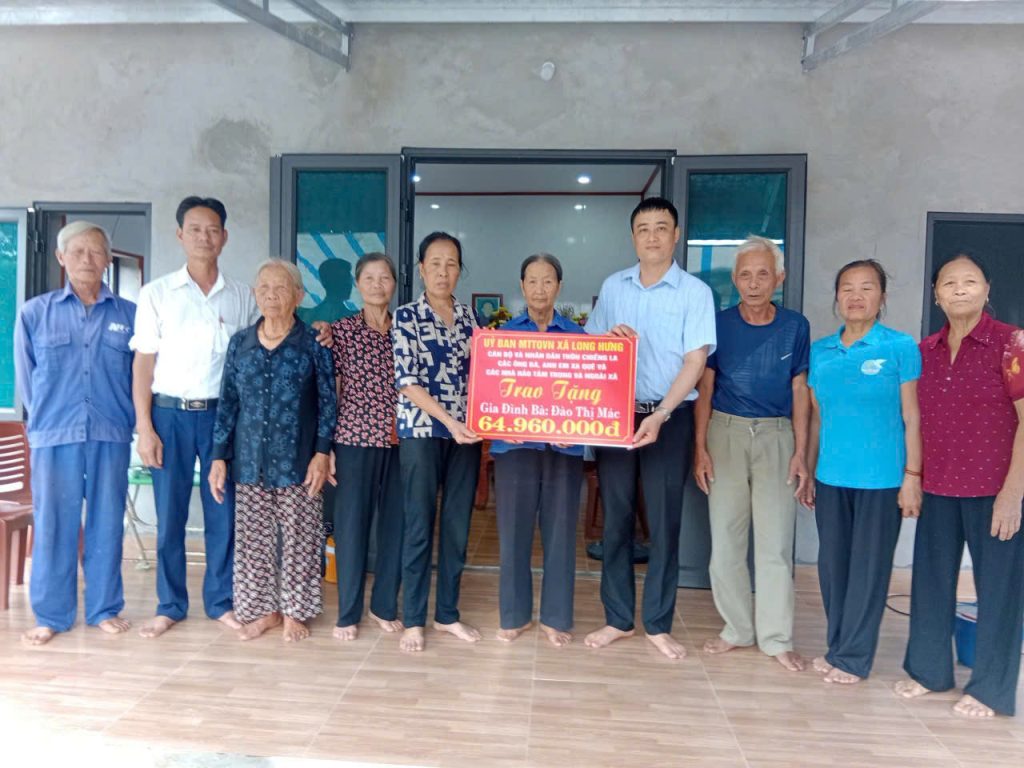 Ngày 07/9/2025 cơ sở thôn Chiềng La, xã Long Hưng tổ chức trao kinh phí của UBMTTQVN xã, các tập thể, cá nhân ủng hộ gia đình bà Đào Thị Mác có hoàn cảnh khó khăn để sửa chữa nhà ở. Tổng số tiền hỗ trợ của các tập thể, cá nhân được 64.960.000đ. Công trình sửa chữa nhà ở của gia đình bà Mác đã hoàn thành, bảo đảm chắc chắn, khang trang. Đây là hoạt động thiết thực, thể hiện sự quan tâm của cấp ủy, chính quyền, các ban, ngành, MTTQ, các đoàn thể, nhân dân trong xã đối với gia đình có hoàn cảnh khó khăn, giúp gia đình ổn định, vươn lên trong cuộc sống.