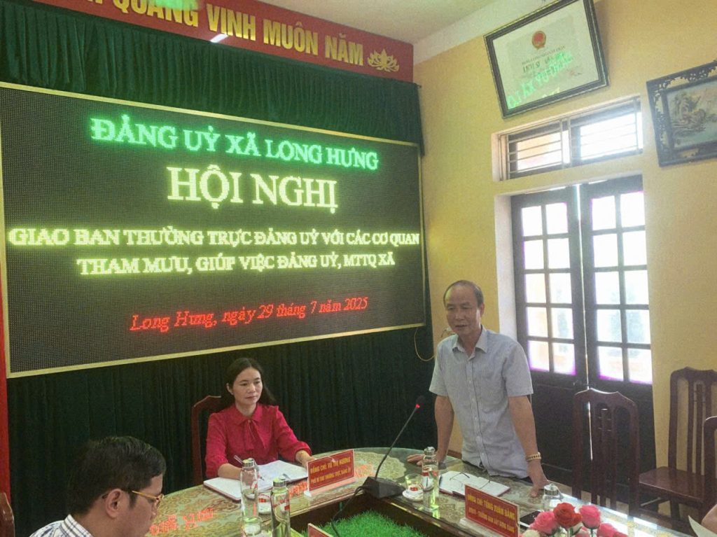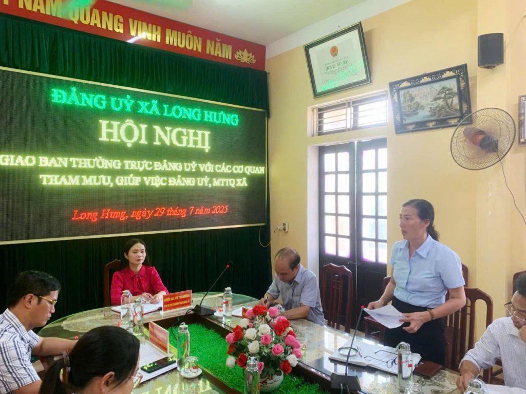 Ngày 29/7/2025 Thường trực Đảng uỷ xã Long Hưng tổ chức giao ban các cơ quan, tham mưu, giúp việc Đảng uỷ và MTTQ xã. Đ/c Vũ Thị Hương, Phó Bí thư Thường trực Đảng uỷ chủ trì hội nghị.